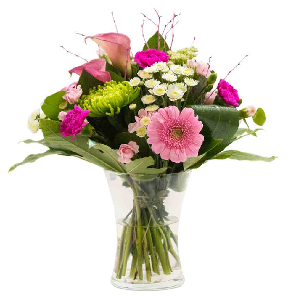 A lovely bright flower arrangement in a vase. Pinks, Whites and Greens. Simple and beautiful. A flower delivery perfect for any occasion. The flower gift will be hand delivered by the local florist along with your special card message.